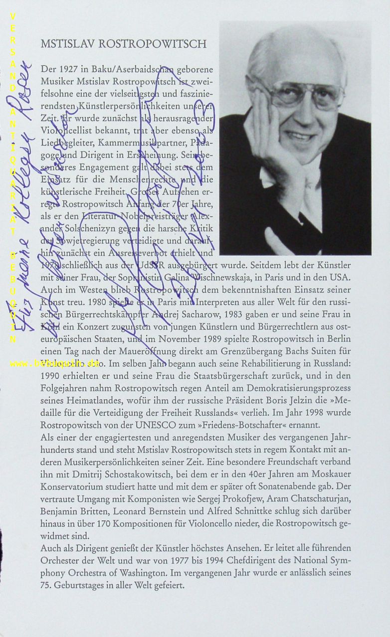 ROSTROPOWITSCH, Mstislaw (Cellist): eigenhändig signierte und datierte Portraitseite mit eigenhändiger Widmung: Für meine Kollegin Rosen mit besten Wünschen. (gemeint ist die Cellistin Rebecca Rosen.) München, 26.6.2003. 26 x 16 cm. 1 Bl. Mstislaw Leopoldowitsch Rostropowitsch (* 27. März 1927 in Baku; † 27. April 2007 in Moskau) war ein russischer Cellist, Dirigent, Pianist, Komponist und Humanist. Er gilt als einer der bedeutendsten Cellisten der Geschichte. (Wikipedia)