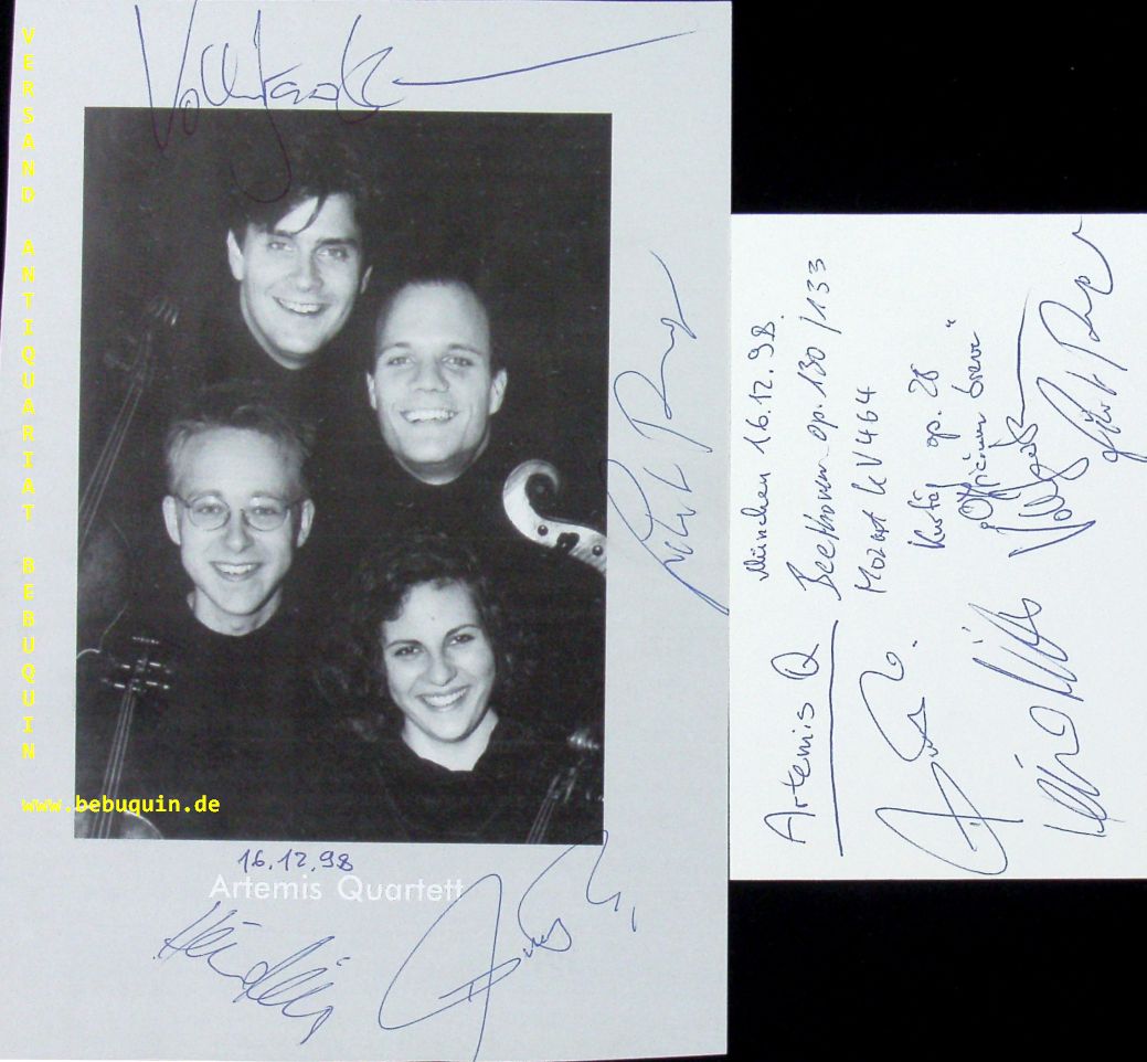 ARTEMIS QUARTETT.– PRISHEPENKO, Natalia + MÜLLER, Heime + JACOBSEN, Volker + RUNGE, Eckart: eigenhändig von allen signierte und datierte Autogrammkarte + ebensolche Portraitseite. München (Herkulessaal), 16.12.1998. 20 x 13,5 + 8 x 12,5 cm. 3 Bl. Das Ensemble wurde 1989 in Lübeck gegründet und ist in Berlin ansässig. Mentoren waren Walter Levin, das Alban Berg Quartett, das Juilliard String Quartet und das Emerson String Quartet. Der Preis des Deutschen Musikwettbewerbs (1995) sowie erste Preise beim ARD Musikwettbewerb (1996) und beim Premio Paolo Borciani (1997) ebneten eine internationale Karriere. Heute gastiert es weltweit in allen großen internationalen Konzertreihen und Festivals. (Wikipedia)