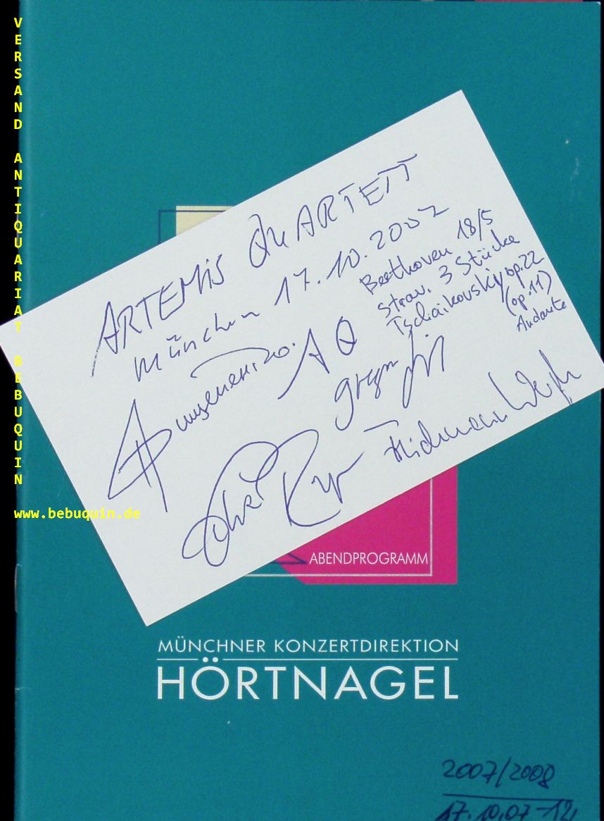ARTEMIS QUARTETT.– PRISHEPENKO, Natalia + SIGL, Gregor + WEIGLE, Friedemann + RUNGE, Eckart: eigenhändig von allen signierte und datierte Autogrammkarte. München (Herkulessaal), 17.10.2002. 21 x 15 + 8 x 12,5 cm. Karteikarte in Prgogrammheft- Das Ensemble wurde 1989 in Lübeck gegründet und ist in Berlin ansässig. Mentoren waren Walter Levin, das Alban Berg Quartett, das Juilliard String Quartet und das Emerson String Quartet. Der Preis des Deutschen Musikwettbewerbs (1995) sowie erste Preise beim ARD Musikwettbewerb (1996) und beim Premio Paolo Borciani (1997) ebneten eine internationale Karriere. Heute gastiert es weltweit in allen großen internationalen Konzertreihen und Festivals. (Wikipedia)