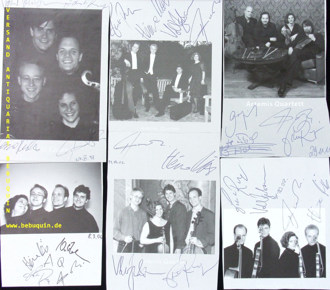 ARTEMIS QUARTETT.– PRISHEPENKO, Natalia + MÜLLER, Heime + JACOBSEN, Volker + RUNGE, Eckart: 14 eigenhändig von allen signierte und datierte Autogrammkarte + 6 ebensolche Portraitseite. München (Herkulessaal), 1997 – 2011. 20 x 13,5 + 8 x 12,5 cm. 20 Bl. Das Ensemble wurde 1989 in Lübeck gegründet und ist in Berlin ansässig. Mentoren waren Walter Levin, das Alban Berg Quartett, das Juilliard String Quartet und das Emerson String Quartet. Der Preis des Deutschen Musikwettbewerbs (1995) sowie erste Preise beim ARD Musikwettbewerb (1996) und beim Premio Paolo Borciani (1997) ebneten eine internationale Karriere. Heute gastiert es weltweit in allen großen internationalen Konzertreihen und Festivals. (Wikipedia)