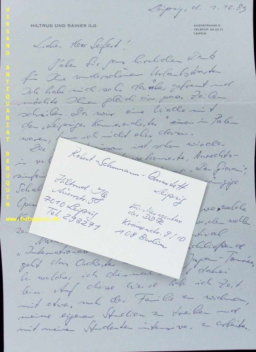 ROBERT SCHUMANN QUARTETT.– ILG, Hiltrud: eigenhändig signierte und datierte Autogrammkarte + zweiseitiger sehr persönlicher eigenhändiger Brief an Willi Seifert über Konzertplanung ost-west. München (Herkulessaal), 28.1.1985. 4°. Karteikarte, Brief und 2 Programmhefte. Hiltrud Ilg war neben der 1. Violine des Robert Schumann Quartetts Leipzig auch in der Künstleragentur der DDR tätig.