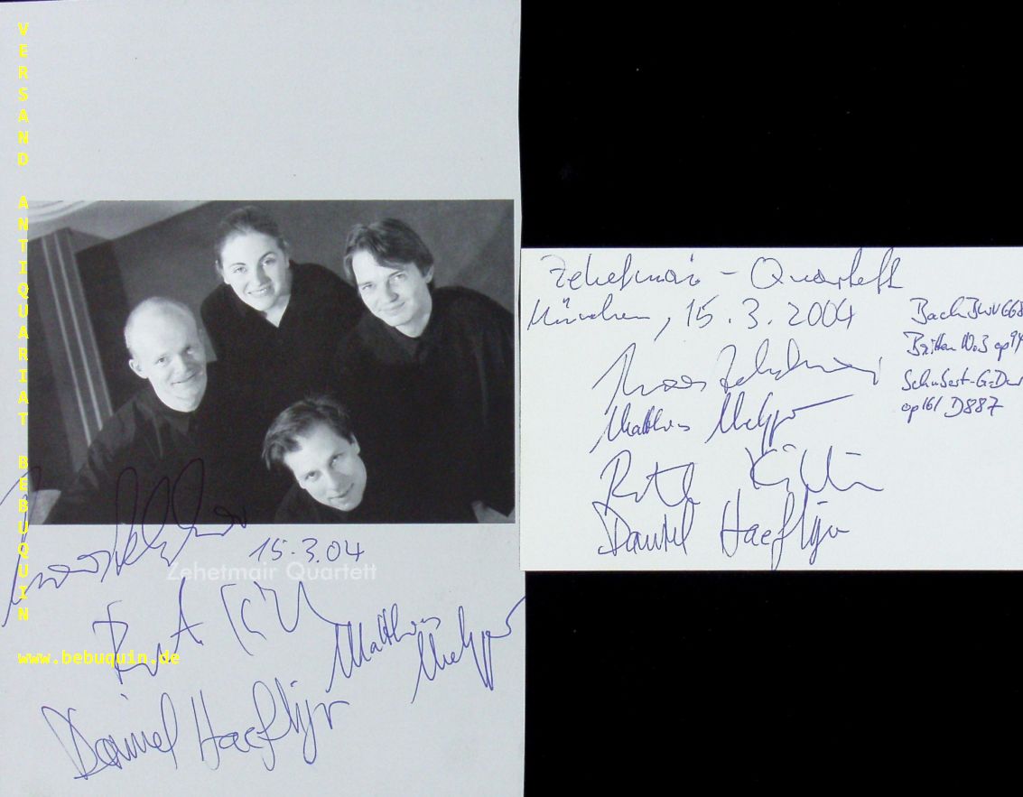 ZEHETMAIR QUARTETT.– ZEHETMAIR, Thomas + METZGER, Matthias + KILIUS, Ruth + HAEFLIGER, Daniel: eigenhändig von allen signierte und datierte Autogrammkarte + eigenhändig signierte Portraitseite. München (Philharmonie), 15.3.2004. 20 x 13 + 8 x 12,5 cm. 3 Bl. Thomas Zehetmair (* 23. November 1961 in Salzburg) ist ein österreichischer Violinist und Dirigent. 1994 gründete er sein eigenes Ensemble, das Zehetmair Quartett, das sich mittlerweile in der Weltspitze der Streichquartette etabliert hat. (Wikipedia)