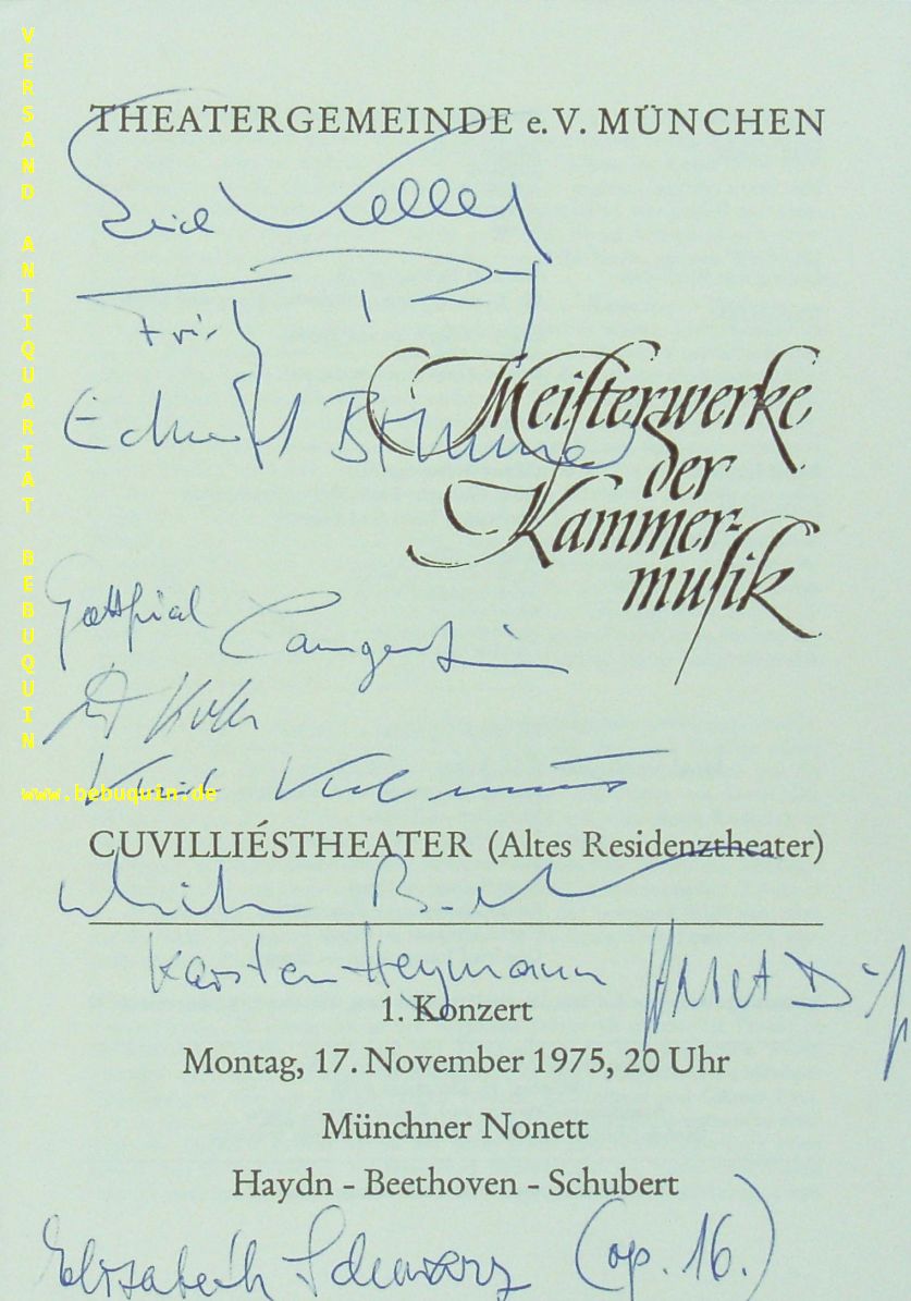 MÜNCHNER NONETT.– KELLER + HEYMANN + RUF + BODE + DUFT + KALMUS + BRUNNER + KOLBINGER + LANGENSTEIN: eigenhändig von allen signiertes und datiertes Programmheft. München, 15.12.1975. 21 x 14,5 cm. 4 S.