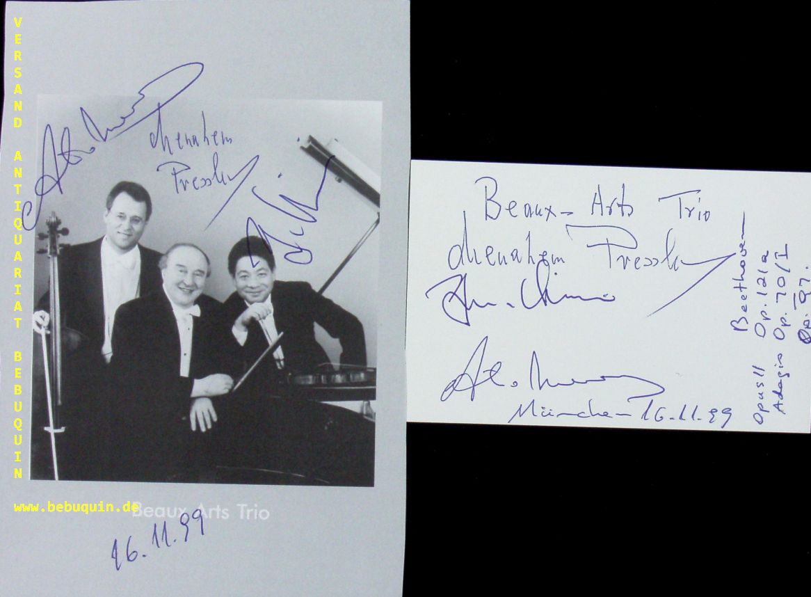 BEAUX ARTS TRIO.– PRESSLER, Menahem (Pianist) + KIM, Young Uck (Violinist) + MENESES, Antonio (Cellist): eigenhändig von allen drei Künstlern signierte und datierte Autogrammkarte + ebenso signierte Portraitseite. München (Philharmonie), 16.11.1999. 18,5 x 13 cm. 2 Bl. Das Beaux Arts Trio war eines der bedeutendsten Klaviertrios weltweit und galt 53 Jahre als wegweisend vor allem im klassisch-romantischen Repertoire. Während seiner ganzen Existenz wurde das Trio vom Pianisten Menahem Pressler zusammengehalten. (Wikipedia)