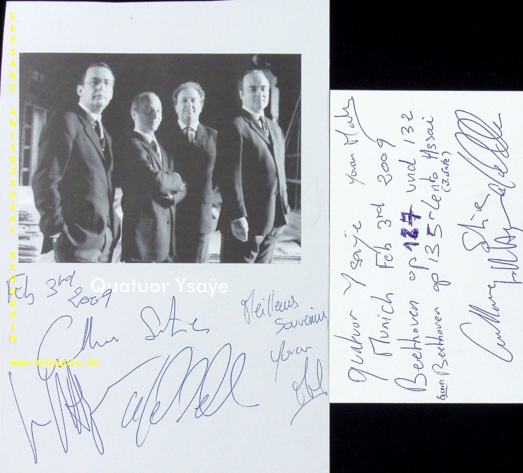 QUATUOR YSAYE.– SUTRE, Guillaume + AGUERA, Luc-Marie + DA SILVA, Miguel + MAKOVITCH, Y0va,: eigenhändig von allen signierte und datierte Autogrammkarte + ebensolche Portraitseite. München (Herkulessaal), 3.2.2009. 20 x 14,5 cm. 3 Bl. Das Quatuor Ysaÿe, international auch Ysaÿe Quartet, war ein von 1984 bis 2014 bestehendes französisches Streichquartett. Es wurde von dem Bratschisten Miguel da Silva zu dessen Studienzeiten am Pariser Konservatorium gegründet und ist nach dem belgischen Violinisten, Quartettspieler und Komponisten Eugène Ysaÿe benannt. (Wikipedia)