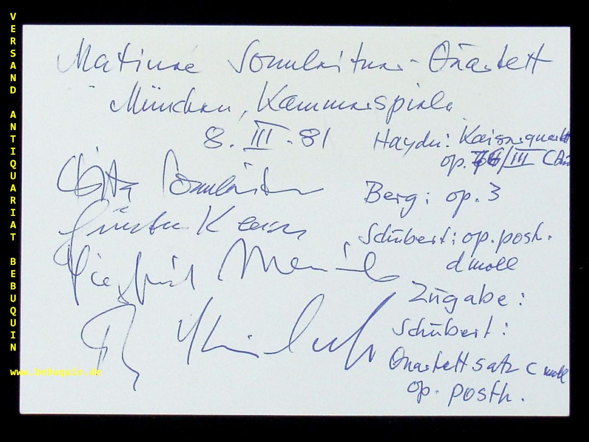 SONNLEITNER QUARTETT.– SONNLEITNER, Fritz (Violinist, Dirigent) + MEINECKE, Siegfried (Bratschist) + KLEIN, Günter + KISKALT, Fritz: eigenhändig signierte und datierte Autogrammkarte. München, 8.3.1981. 10,5 x 14,5 cm. große Karteikarte.