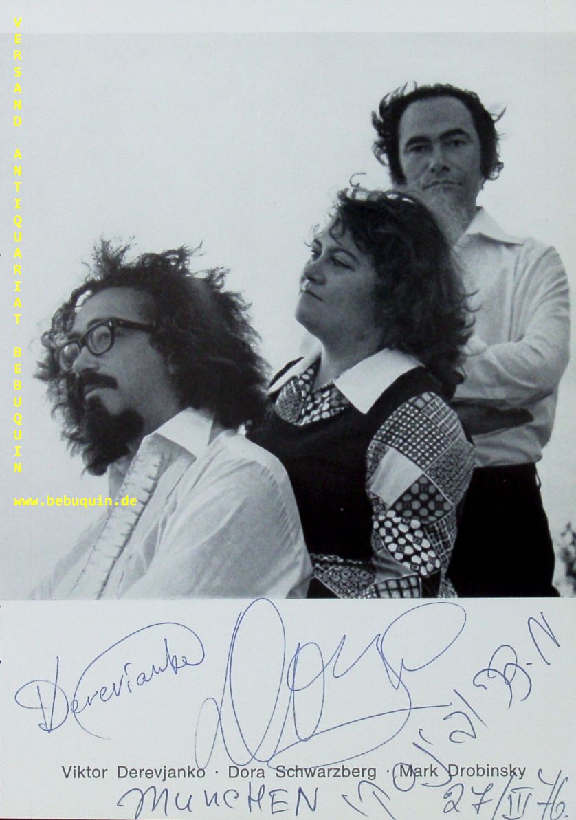 SCHWARZBERG, Dora + DEREVJANKO, Viktor + DROBINSKY, Mark: eigenhändig datierte und von allen signierte Portraitseit. München, 27.3.1976. 21 x 15 cm. 1 Bl.