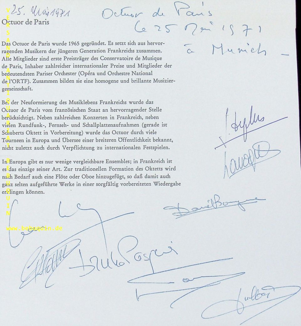 OCTOUR DE PARIS.– SAJOT, Jean-Louis + BOURGUE, Daniel + LAURIDON, Gabin + LAROQUE, Jean-Pierre Laroque u.a.: eigenhändig signierte und datierte Programmseite. München (Herkulessaal), 25.5.1971. 20 x 19 cm. 1 Bl. Das Octour de Paris wurde 1965 gegründet. Es setzte sich aus hervorragenden Musikern der jüngeren Generation Frankreichs zusammen.