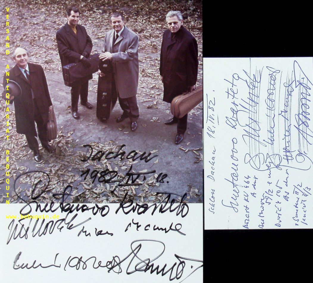 SMETANA-QUARTETT.– KOHOUT, Antonin + NOVAK, Jiri + KOSTECKY, Lubomir + SKAMPA, Milan: eigenhändig von allen signierte farbige Portraitseite + eigenhändig von allen signierte und datierte Autogrammkarte. München, 18.4.1982. 21 x 15 cm. 3 Bl. Das Smetana-Quartett war ein tschechisches Streichquartett, das von 1945 bis 1989 bestand. Es entstand aus dem Streichquartett des Tschechischen Konservatoriums, das 1943, während der nationalsozialistischen Besatzungszeit, vom Cellisten Antonin Kouhout gegründet worden war. (Wikipedia)