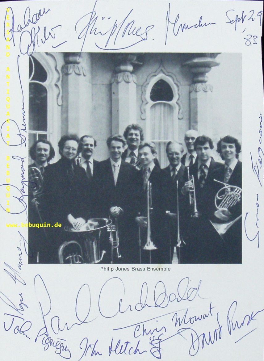 PHILIP JONES BRASS ENSEMBLE.– JONES / ARCHIBALD / ASHTON / FERGUSON / HARVEY / MOWAT / PURSER / PREMRU / PIGNEGUY / FLETCHER: eigenhändig von allen signierte und datierte Portraitseite. München (Herkulessaal); 29.9.1983. 20 x 14,5 cm. 3 Bl. Das Philip Jones Brass Ensemble war ein Blechbläserensemble, das 1951 von Philip Jones in England gegründet wurde und großen Einfluss auf die Blechbläsermusik hatte. Es bildete den Grundstock für die Entwicklung von ähnlichen, hochstehenden Ensembles wie Canadian Brass, Empire Brass, German Brass, Swiss Brass Consort und vielen mehr. Es wurde 1986 aufgelöst. (Wikipedia)