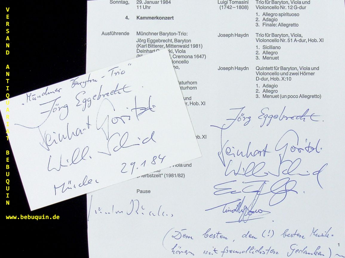 TERWILLER, Eric (Hornist) + JONES, Timothy (Hornist) + EGGEBRECHT, Jörg + GORITZKI, Deinhart + SCHMID, Willi: eigenhändig von allen signierte Programmseite und datierte und signierte Autogrammkarte. München (Herkulessaal), 21.1.1984. unterschiedliche Größen. 2 Bl.