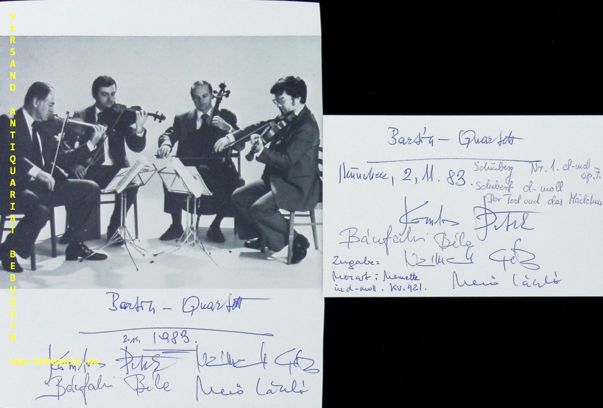 BARTOK QUARTETT.– KOMLOS, Peter + BANVALVY, Bela + NEMETH, Geza + MEZO, Laszlo: eigenhändig signierte und datierte Autogrammkarte + ebensolche Portraitseite. München (Herkulessaal), 2.11.1983. 18,5 x 14,5 cm. 3 Bl. Das Bartók Quartett ist ein ungarisches Streichquartett, gegründet 1963 in Budapest als Nachfolge-Ensemble des Komlós Quartetts (1957–63). Das Repertoire umfasst besonders Werke der Wiener Klassik und Béla Bartóks sowie zeitgenössischer ungarischer Komponisten. (Wikipedia)