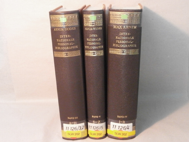 ARNIM, Max + HODES, Franz: Internationale Personalbiographie. 2. völlig neubearb. Aufl. von Band III (Berichtszeit 1944 – 1959) in drei bis zum jeweilgen Erscheinungsjahr ergänzten Bänden III – V. 3 Bände (A – Z). Stuttgart (Hiersemann), 1981, 1984, 1987. XVI, 1443, 466 S. OHldr mit goldgeprägtem Rücken. Ordnungsgemäß aus Bundeswehrbeständen ausgesondertes Bibliotheksexemplar (Stempel, Rückenschild), feines Ex.