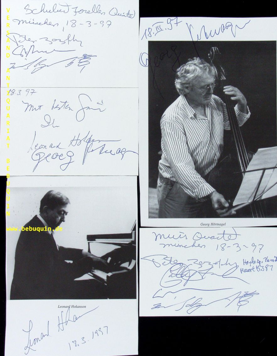 MUIR QUARTETT: HOKANSON, Leonard (Pianist) + HÖRTNAGEL, Georg (Bassist) + ZAZOFSKY, Peter (Violinist) + ANSELL, Steven (Bratschist) + KEYES, Bayla (Violinistin) + REYNOLDS, Michael (Cellist): 3 eigenhändig von allen signierte Autogrammkarten + 2 von den Gästen signierte Portraitseiten. München (Philharmonie), 18.3.1997. unterschiedliche Größen. 3 Karteikarten etc. Leonard Ray Hokanson (* 13. August 1931 in Vinalhaven (Maine); † 21. März 2003 in Bloomington (Indiana)) war ein US-amerikanischer Pianist mit schwedischen Vorfahren. Muir Quartett ist ein amerikanisches Streichquartett seit 1979. (Wikipedia)