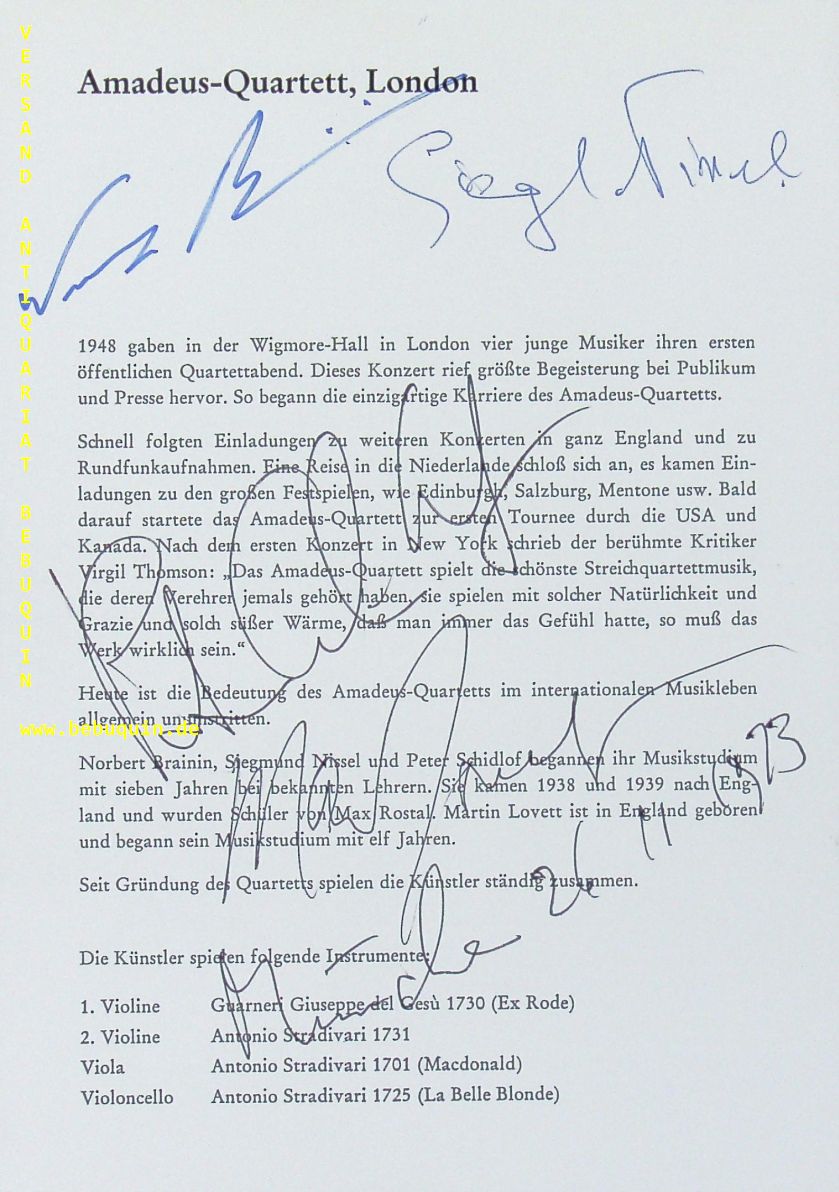 AMADEUS QUARTET.– SCHIDLOF, Peter + BRAININ, Norbert + NISSEL, Siegmund + LOVETT, Martin: eigenhändig von allen signierte und datierte Programmseite. München, 26.11.1973. 21 x 15 cm. 1 Bl. Das Amadeus-Quartett war ein bekanntes Streichquartett des 20. Jahrhunderts. Es wurde 1947 in London gegründet. (Wikipedia)