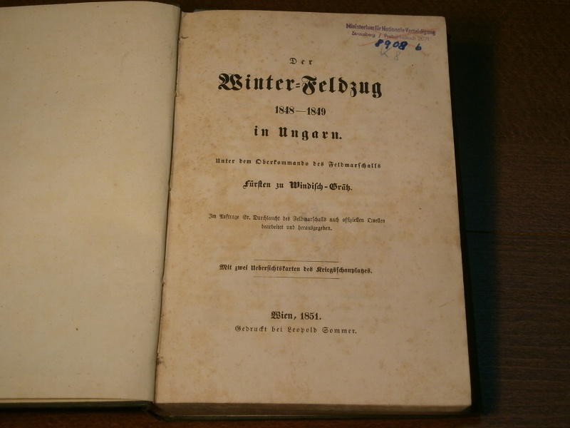 WINDISCH-GRÄTZ, Fürst zu: Der Winter – Feldzug 1848 – 1849 in Ungarn. Unter dem Oberkommando des Feldmarschalls. Wien (Sommer), 1851. VIII, 513 (1) S. mit 1 (von 2) Übersichtskarte des Kriegsschauplatzes. Ln der Zeit mit goldgeprägtem Rücken. Ordnungsgemäß aus Bundeswehrbeständen ausgesondertes Bibliotheksexemplar (Stempel, Rückenschild), etwas angeschmutzt, innen teils etwas stockig. EA.