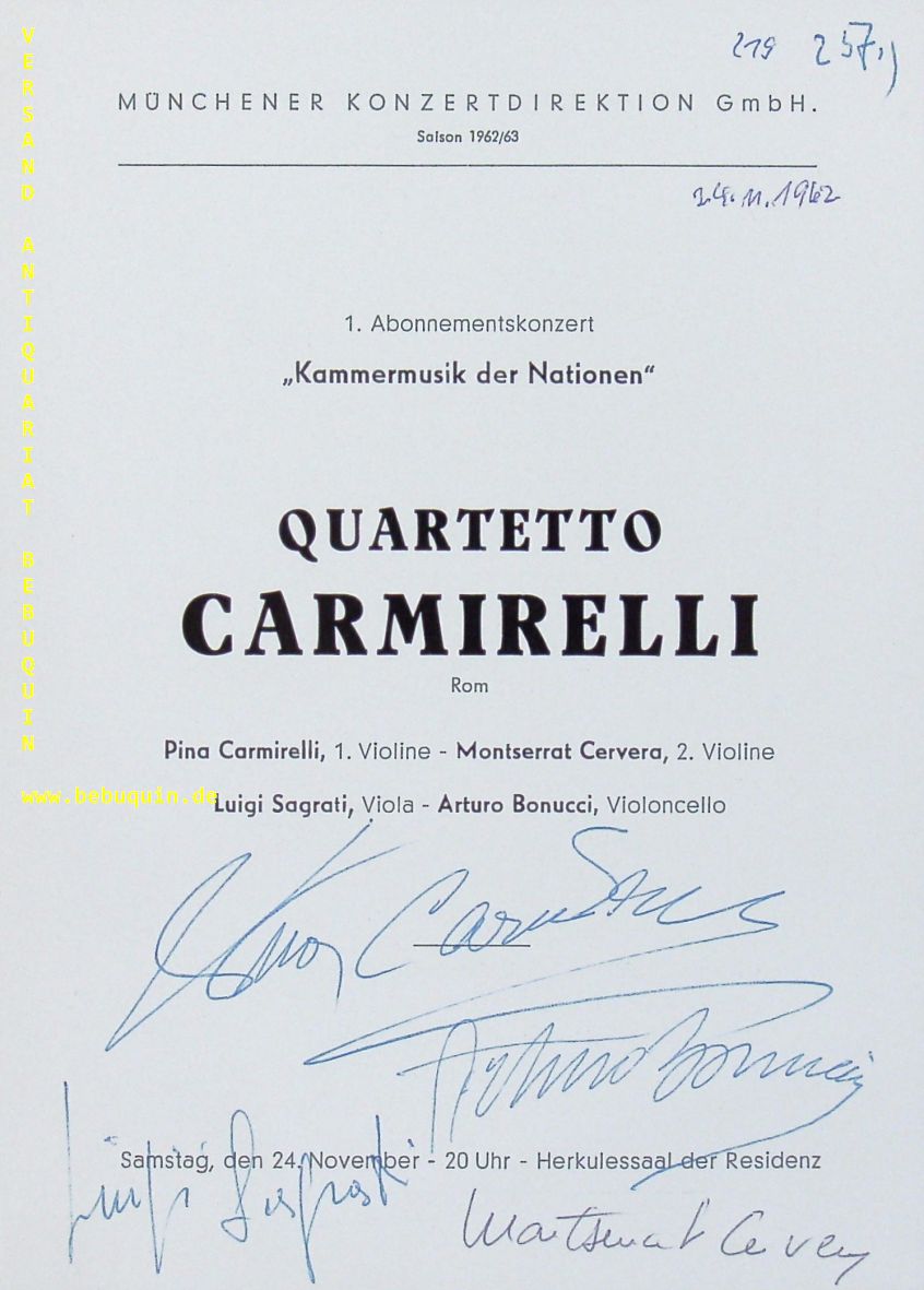 QUARTETTO CARMIRELLI.– CARMIRELLI, Pina + CERVERA, Montserrat + SAGRATI, Luigi + BONUCCI, Arturo: eigenhändig von allen signierte Programmseite. München (Herkulessaal), 24.11.1962. 21 x 15 cm. 1 Bl. Giuseppina Carmirelli (* 23. Januar 1914 in Varzi; † 27. Februar 1993 in Capena) war eine italienische Violinistin.