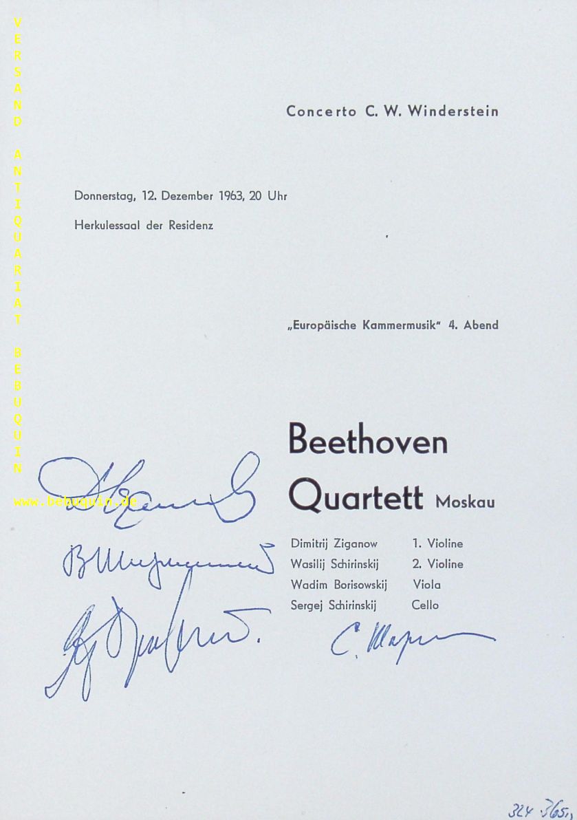 BEETHOVEN QUARTETT MOSKAU.– ZYGANOW, Dimitrij + SCHIRINSKIJ, Wasilij + BORISOWSKIJ, Wadim+ SCHIRINSKIJ, Sergej: eigenhändig von allen signierte Programmseite. München, 12.12.1963. 21 x 15 cm. 1 Bl. Dmitri Michailowitsch Zyganow (* 27. Februarjul./ 12. März 1903greg. in Saratow; † 25. März 1992 in Moskau) war ein sowjetisch-russischer Violinist und Musikpädagoge. Bekannt wurde er als langjähriger Violinprofessor des Moskauer Konservatoriums und Primarius des Beethoven-Streichquartetts. (Wikipedia)