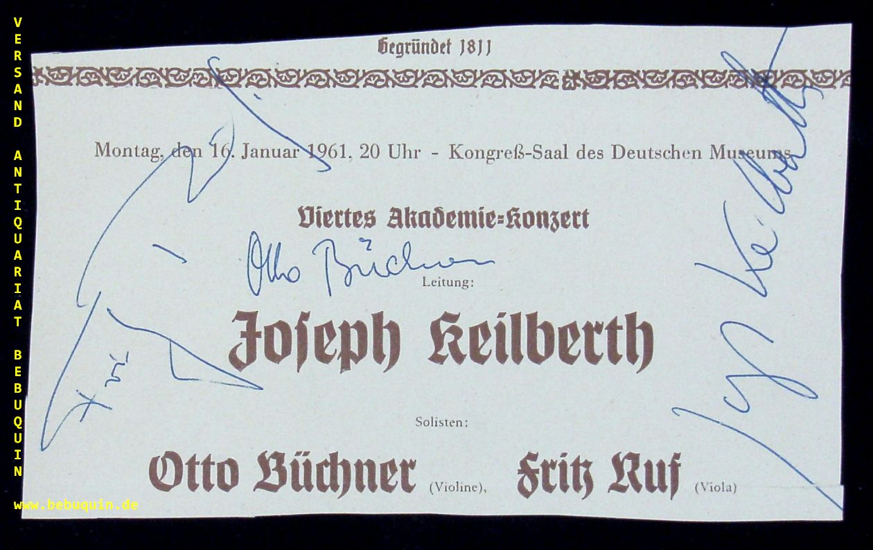 KEILBERTH, Joseph (Dirigent) + RUF, Fritz (Bratschist) + BÜCHNER, Otto (Violinist): eigenhändig von allen signierte Programmseite. München (Kongresssaal), 16.1.1961. 10 x 18 cm. 1 Bl. Joseph Keilberth (* 19. April 1908 in Karlsruhe; † 20. Juli 1968 in München) war ein deutscher Konzert- und Operndirigent.