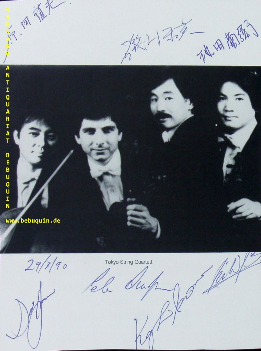 TOKYO STRING QUARTET: OUNDIJAN, Peter + IKEDA, Kikuei + ISOMURA, Kazuhide + HARADA, Sadao: eigenhändig signierte und datierte Autogrammkarte + eigenhändig signierte Portraitseite. München (Herkulessaal), 29.3.1990. 20 x 14 cm. 5 Bl. Das Tokyo String Quartet war ein renommiertes Streichquartettensemble, das 1969 an der Juilliard School of Music gegründet wurde und sich im Juli 2013 auflöste. (Wikipedia)
