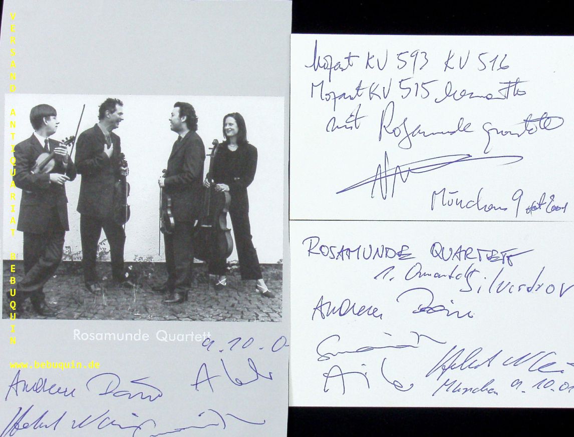 ROSAMUNDE QUARTETT.– MENDELSSOHN, Vladimir (Bratschist) + REINER, Andres + FORDHAM, Simon + NICOLAI, Helmut + LECHNER, Anja: 2 eigenhändig signierte und datierten Autogrammkarten + ebenfalls signierte Portraitseite. München (Herkulessaal), 7.11.1996. 5 Bl. Das Rosamunde Quartett war ein 1992 gegründetes deutsches Streichquartett, das bis 2009 bestand. Der Name des Ensembles geht auf Franz Schuberts Streichquartett Nr. 13 „Rosamunde“ zurück. (Wikipedia)