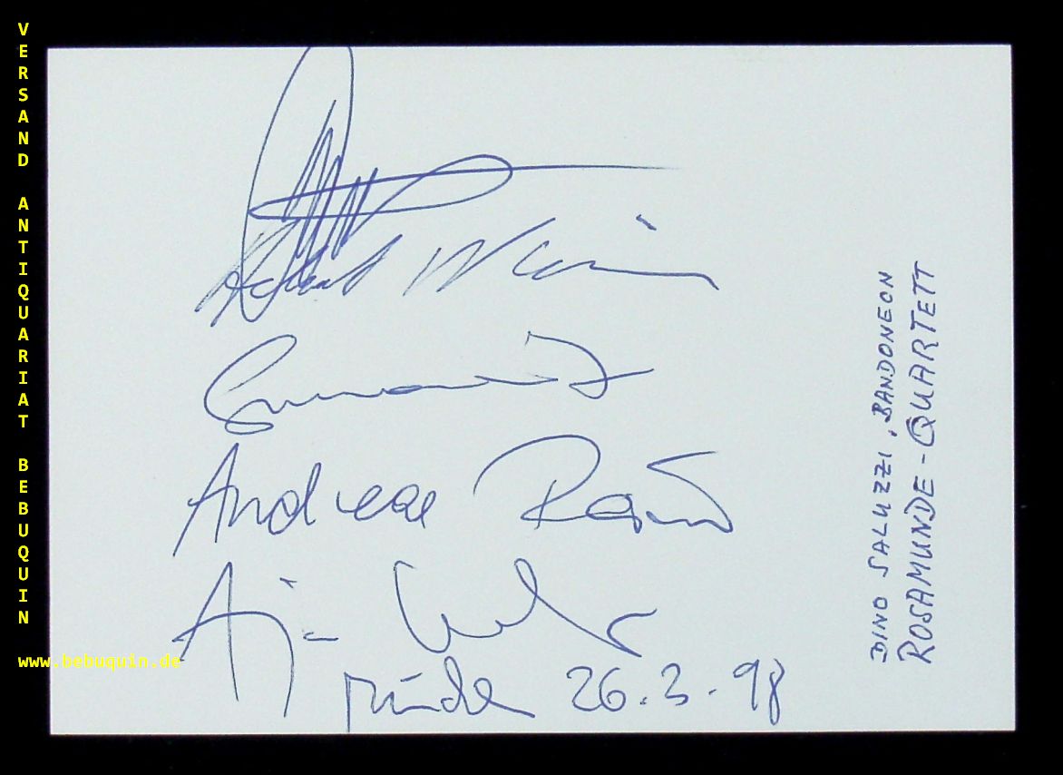 ROSAMUNDE QUARTETT.– SALUZZI, Dino (Bandoneonist) + REINER, Andres + FORDHAM, Simon + NICOLAI, Helmut + LECHNER, Anja: eigenhändig von allen signierte und datierten Autogrammkarte. München (Herkulessaal), 26.3.1998. 10 Bl. mit schöner Doppelpostkarte etc. Timoteo „Dino“ Saluzzi (* 20. Mai 1935 in Campo Santo (Ingenio San Isidro), Provinz Salta, Argentinien) ist ein argentinischer Bandoneonspieler und Komponist. Martin Kunzler zufolge ist er der „vitale Improvisator des Tango Nuevo.“ Er hat ihn rhythmisch aufgerüstet, geöffnet, als Tango Libre – so der programmatische Titel einer seiner Kompositionen – dialogfähig mit vielen Spielarten der improvisierten Musik gemacht und eine eigene Form des Ethno-Jazz geschaffen. Das Rosamunde Quartett war ein 1992 gegründetes deutsches Streichquartett, das bis 2009 bestand. Der Name des Ensembles geht auf Franz Schuberts Streichquartett Nr. 13 „Rosamunde“ zurück. (Wikipedia)