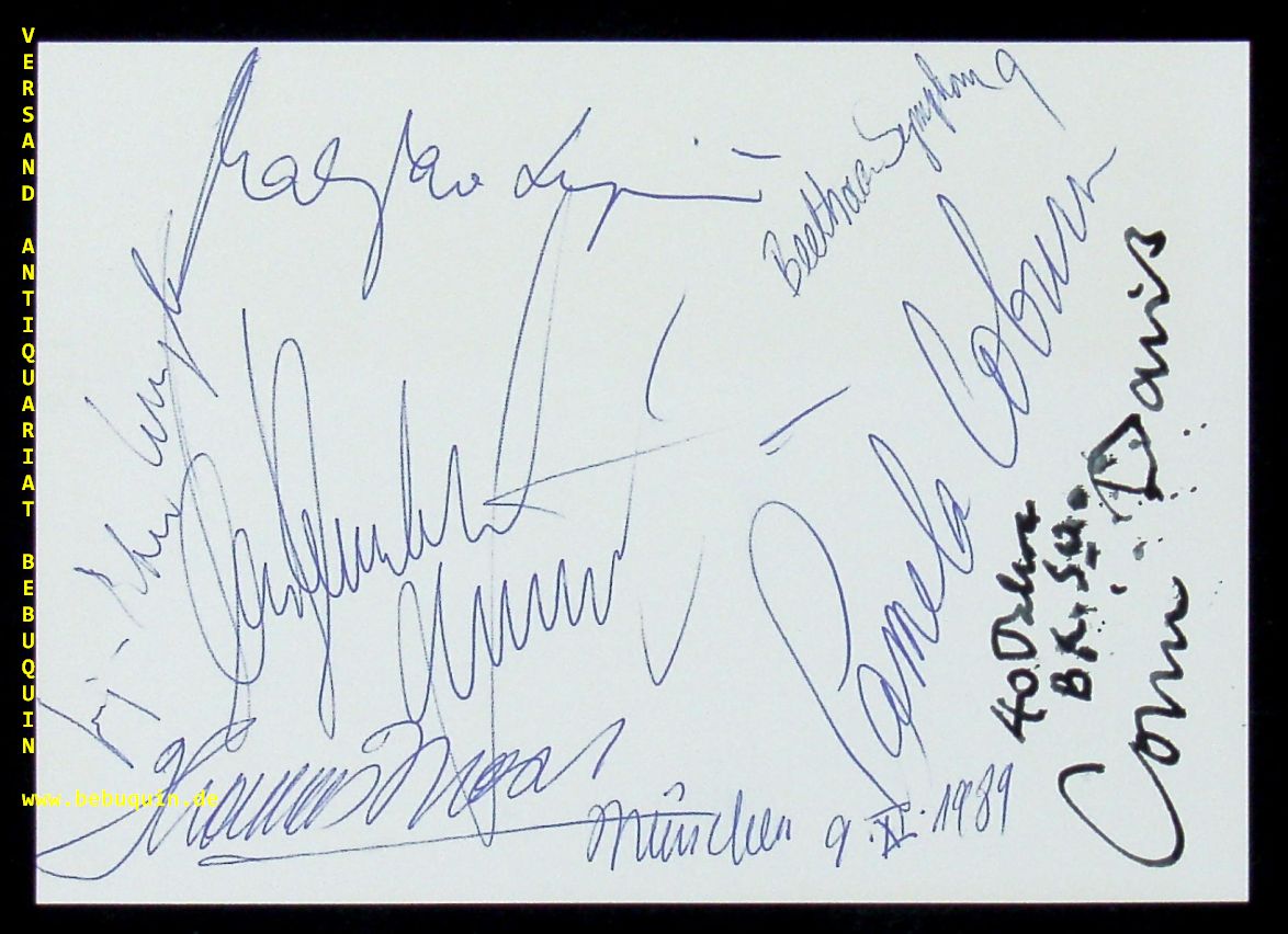 DAVIS, Sir Colin (Dirigent) + COBURN, Pamela (Sopran) + LIPOVSEK, Marjana (Alt) + MOSER, Thomas (Tenor) + ROOTERING, Jan-Hendrik (Bass) + WEIGLE, Jörg-Peter (Chorleitung): eigenhändig signierte und datierte Autogrammkarte. Mit dem Symphonieorchesters des BR. München (Philharmonie), 9./10.11.1989. 4°. große Karteikarte. kaum tintenfleckig. Sir Colin Rex Davis (* 25. September 1927 in Weybridge; † 14. April 2013 in London) war ein englischer Dirigent. (Wikipedia)