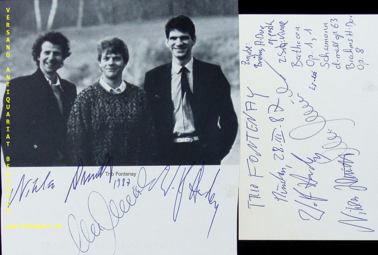 TRIO FONTENAY.– HARDEN, Wolf + MÜCKE, Michael + SCHMIDT, Niklas: eigenhändig von allen signierte und datierte Autogrammkarte + ebensolche Portraitseite. München (Herkulessaal), 28.3.1987. 15 x 12,5 cm. 3 Bl. Das Trio Fontenay war ein 1980 in Hamburg gegründetes und bis 2006 bestehendes Klaviertrio. In der Gründungsformation bestand es aus dem Pianisten Wolf Harden (* 1962), dem Geiger Michael Mücke (* 1962) und dem Cellisten Niklas Schmidt (* 1958). Nach dem Ausscheiden von Niklas Schmidt 1998 übernahm Jens Peter Maintz den Cellopart. (Wikipedia)
