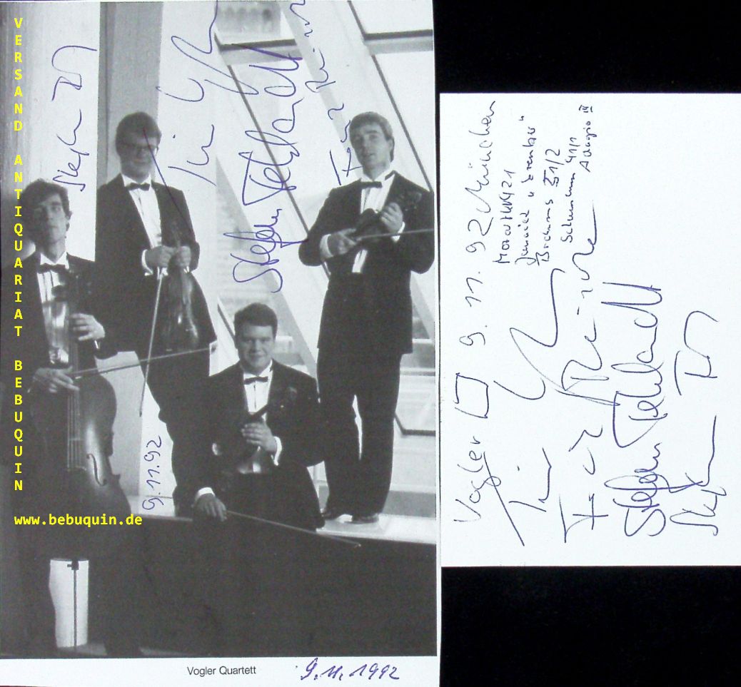 VOGLER QUARTETT.– VOGLER, Tim + REINECKE, Frank + FEHLANDT, Stefan + FORCK, Stephan: eigenhändig von allen signierte und datierte Autogrammkarte + ebensolche Portraitseite.. München (Herkulessaal), 9.11.1992. 18,5 x 12 + 8 x 12,5 cm. 3 Bl. Das Vogler Quartett ist ein in Berlin ansässiges deutsches Streichquartett. Es gründete sich 1985 und spielt seit Anfang 1986 in unveränderter Besetzung zusammen. (Wikipedia)