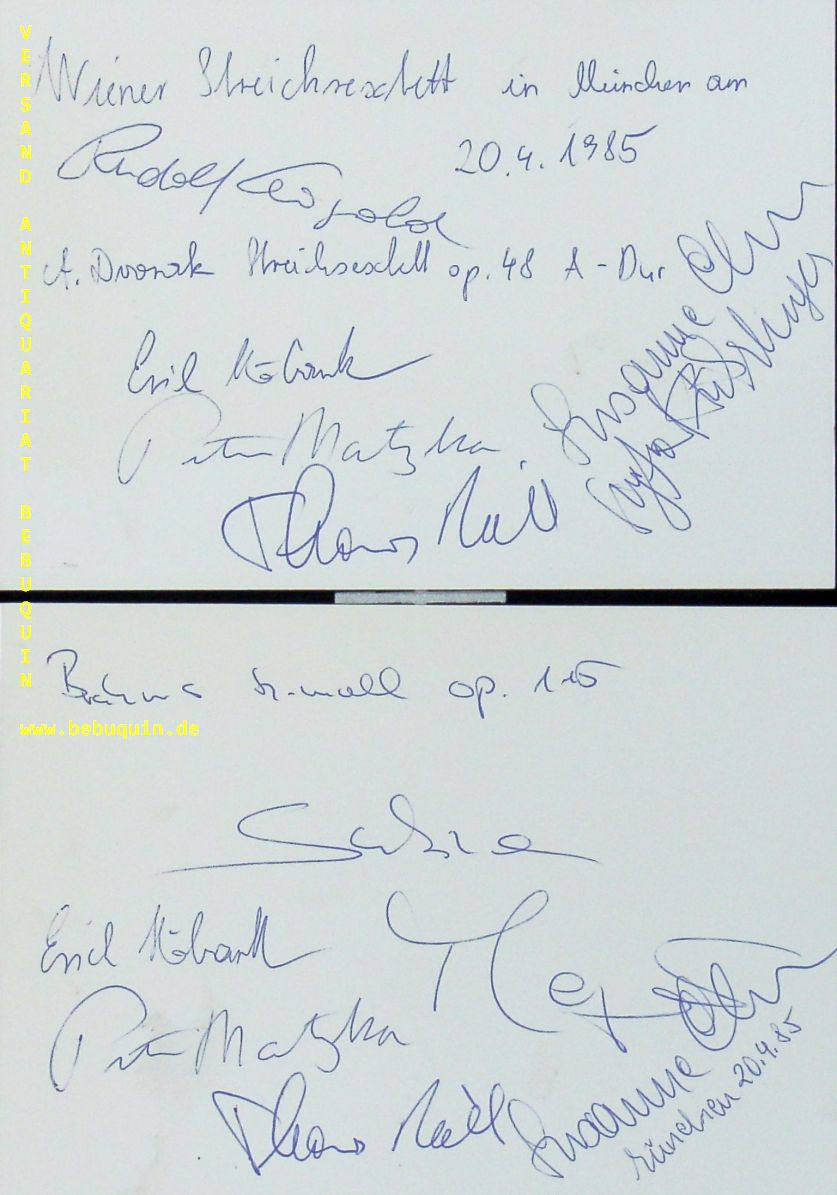 WIENER STREICHSEXTETT.– MEYER, Sabine (Klarinettistin) + HÖBARTH + MATZKLA + RIEBL + FÜHRLINGER + LEOPOLD + EHN: 2 eigenhändig von allen signierte und datierte Autogrammkarten. München (Philharmonie), 20.4.1985. 10,5 x 14,5 cm. 2 große Karteikarte. Sabine Meyer (* 30. März 1959 in Crailsheim) ist eine deutsche Klarinettistin, die international als Solistin auftritt und weltweit zu den renommiertesten Intrumentalsolisten überhaupt gerechnet wird. Zudem ist sie Professorin für Klarinette und Kammermusik an der Musikhochschule Lübeck. (Wikipedia)
