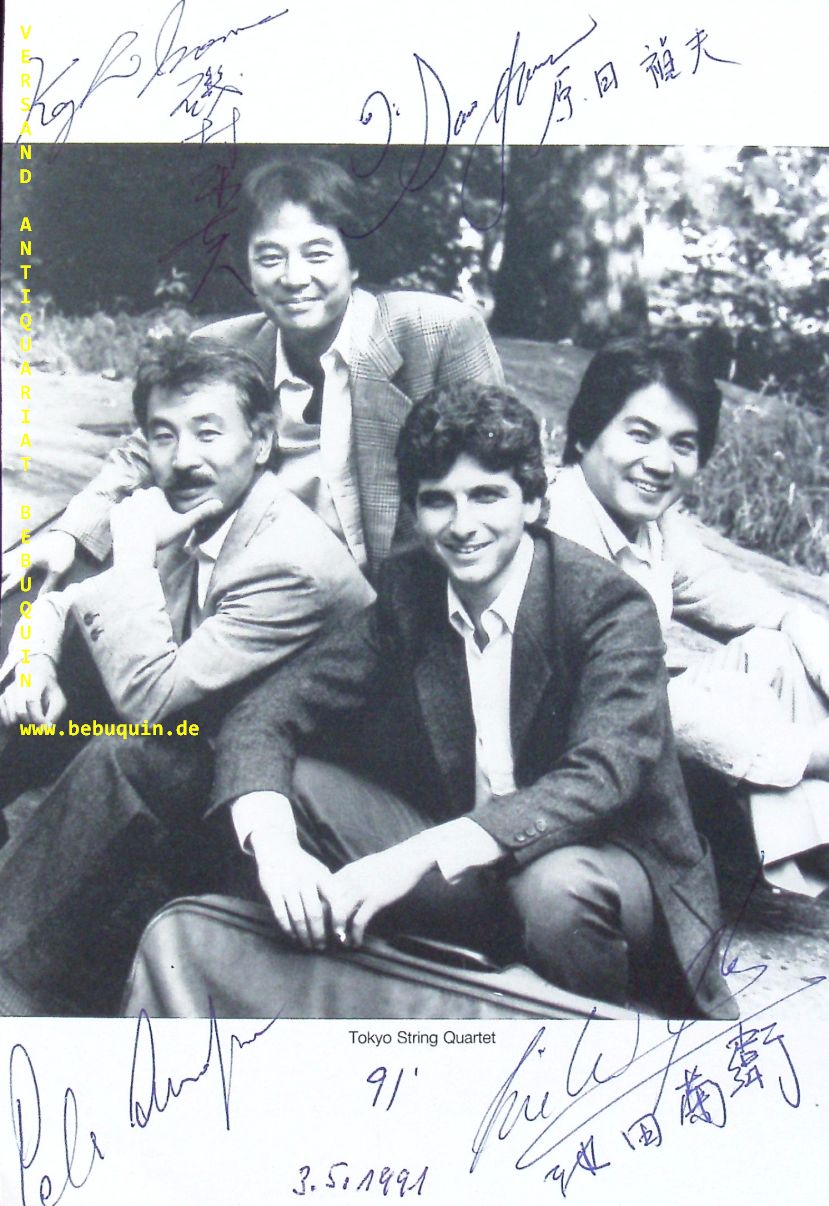 TOKYO STRING QUARTET: OUNDIJAN, Peter + IKEDA, Kikuei + ISOMURA, Kazuhide + HARADA, Sadao: eigenhändig (zweisprachig) signierte und datierte Portraitseite. München (Herkulessaal), 3.5.1991. 21 x 14,5 cm. 1 Bl. Das Tokyo String Quartet war ein renommiertes Streichquartettensemble, das 1969 an der Juilliard School of Music gegründet wurde und sich im Juli 2013 auflöste. (Wikipedia)