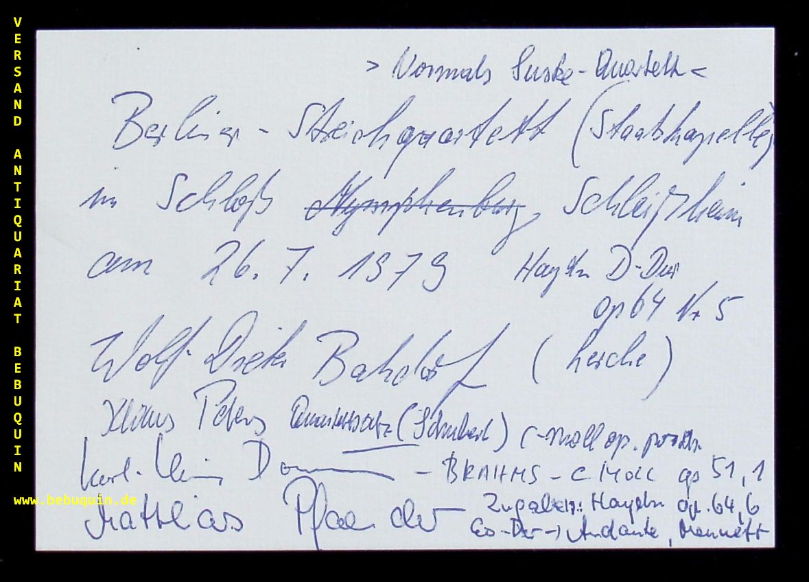 BERLINER STREICHQUARTETT.– BATZDORF, Wolf-Dieter + PETERS, Klaus + DOMMUS, Karl-Heinz + PFÄNDER, Mathias: eigenhändig signierte und datierte Autogrammkarte. München (Herkulessaal), 26.7.1979. 10,5 x 14,5 cm. 4 Bl. vormals Suske – Quartett. (Wikipedia)