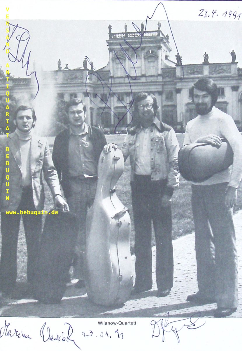 WILANOW QUARTET.– GADZINA, Tadeusz + LOSAKIEWICZ, Pawel + DUZ, Ryszard + WASIOLKA, Marian: eigenhändig von allen signierte und datierte Portraitseite. München, 23.4.1991. 21 x 14,5 cm. 1 Bl. Das Wilanow-Quartett ist ein polnisches Streichquartett, das im Jahr 1967 in Warschau gegründet wurde. Dieses Instrumentalquartett besteht aus Tadeusz Gadzina und Pawel Losakiewicz (Violine), Ryszard Duz (Viola) und Marian Wasiólka (Violoncello). Zum Namen: Wilanów (von italienisch: Villanova) ist heute ein südlicher Stadtbezirk von Warschau am westlichen Ufer der Weichsel. (Wikipedia)