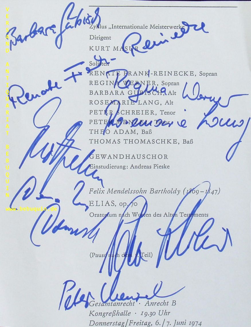 SCHREIER, Peter (Tenor)+ ADAM, Theo + TOMASCHKE + FRANK-REINECKE + GUBISCH + WERNER + MENZEL u.a.: eigenhändig von allen signierte Programmseite. Leipzig, 6.6.1974. 18 x 14 cm. 1 Bl. Peter Schreier (* 29. Juli 1935 in Meißen; † 25. Dezember 2019 in Dresden) war ein deutscher Sänger (Tenor) und Dirigent. (Wikipedia)