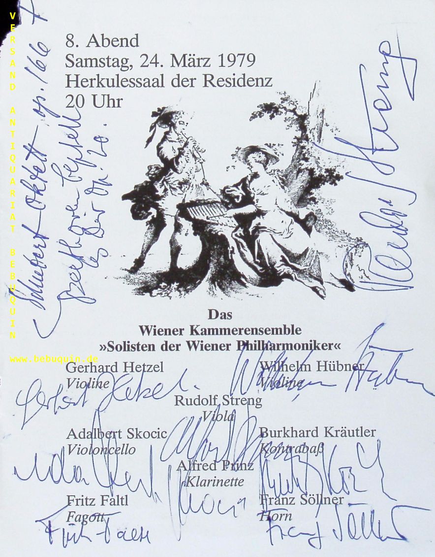 WIENER KAMMERENSEMBLE.– PRINZ, Alfred + HETZEL, Gerhard + HÜBNER, Wilhelm + STRENG, Rudolf + SKOCIC, Adalbert + KRÄUTLER, Burkhard + FALTL, Fritz + SÖLLNER, Franz: eigenhändig von allen signierte und datierte Programmseite. München (Herkulesssaal), 24.3.1979. 19 x 15 cm. 2 Bl. Die Wiener Philharmoniker setzen sich aus Mitgliedern des Wiener Staatsopernorchesters zusammen und gelten als eines der führenden Orchester der Welt. (Wikipedia)