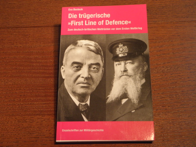 BESTECK, Eva: Die trügerische „First Line of Defence“. Zum deutsch-britischen Wettrüsten vor dem ersten Weltkrieg. Mit einem Anhang „Taktische und Strategische Dienstschriften des Oberkommandos der Marine, Nr. IX.“ Freiburg (Rombach), 2006. 215 S. mit Abb. ill. OKart. Ordnungsgemäß aus Bundeswehrbeständen ausgesondertes Bibliotheksexemplar (Stempel, Rückenschild). = Einzelschriften zur Militärgeschichte, Bd. 43. EA.