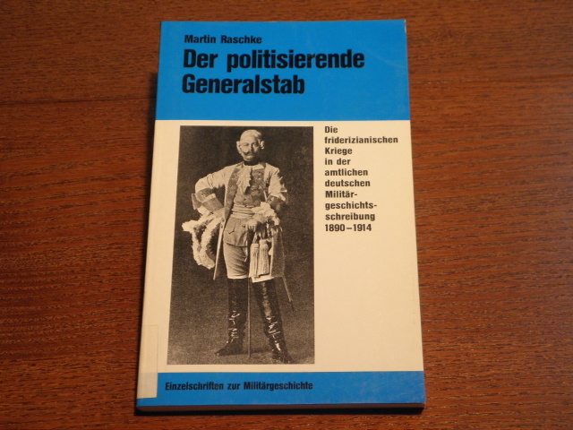 RASCHKE, Martin: Der politisierende Generalstab. Die friderizianischen Kriege in der amtlichen deutschen MIlitärgeschichtsschreibung 1890 – 1914. Freiburg (Rombach), 1993. 218 (1) S. ill. OKart. Ordnungsgemäß aus Bundeswehrbeständen ausgesondertes Bibliotheksexemplar (Rückenschild und Stempel). = Einzelschriften zur Militärgeschichte, Bd. 36. EA.