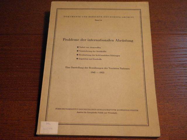 VOLLE, Hermann: Probleme der internationalen Abrüstung. Eine Darstellung der Bemühungen der Vereinten Nationen 1945 – 1955. Frankfurt (Forschungsinstitut), 1956. 4°. IXX, 192 S. OKart. Ordnungsgemäß aus Bundeswehrbeständen ausgesondertes Bibliotheksexemplar (Stempel, Rückenschild). = Dokumente und Berichte des Europa-Archivs, Bd. 14. EA.