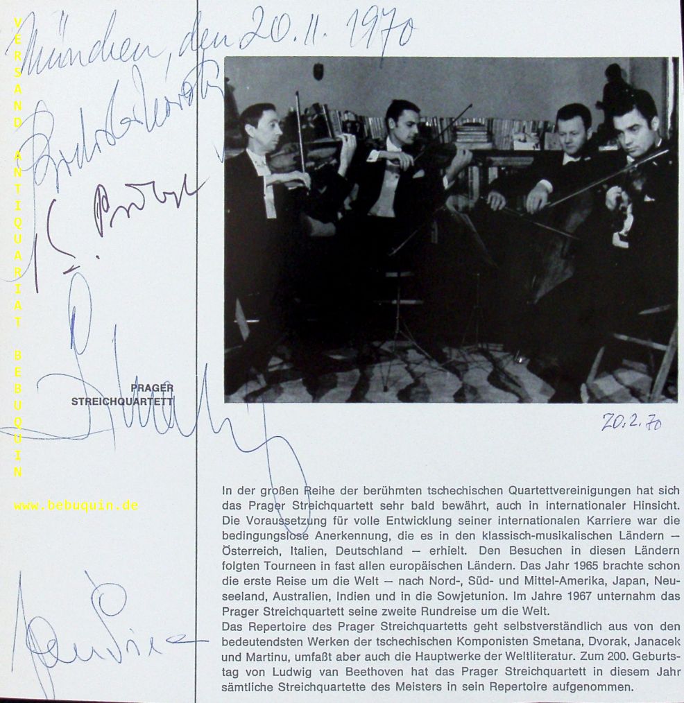 PRAGER STREICHQUARTETT.– NOVOTNY + PRIBYL + MALY + SIRC: eigenhändig von allen signierte und datierte Portraitseite. München (Herkulessaal), 20.2.1970. 19 x 19 cm. 3 Bl.