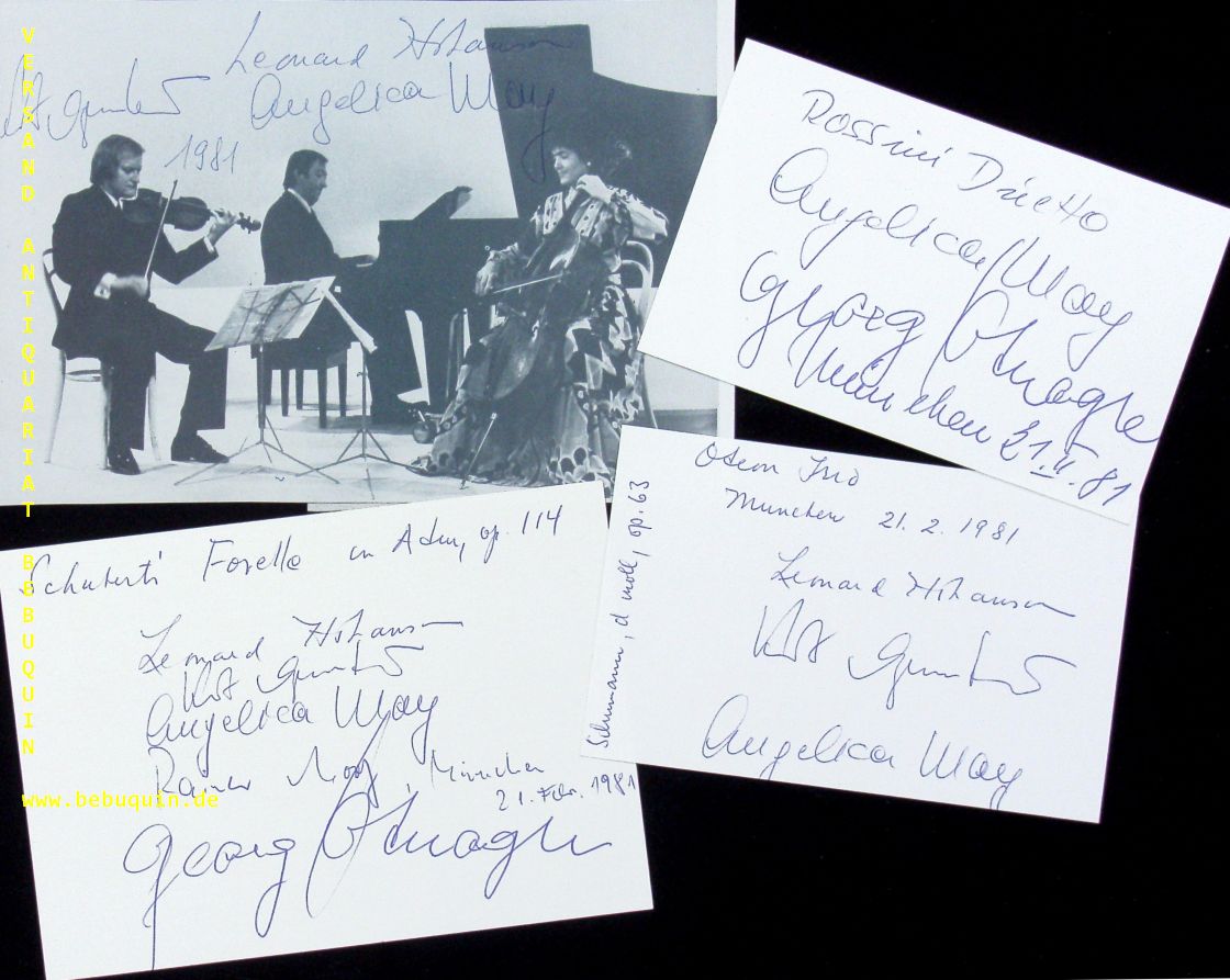 ODEON TRIO.– MAY, Angelica (Cellistin) + GUNTNER, Kurt (Violinist) + HOKANSON, Leonard (Pianist) + HÖRTNAGEL, Georg + MAY, Rainer: 3 eigenhändig von allen signierte und datierte Autogrammkarten und ebensolche Bildseite (jedes von Angelika May signiert). München (Herkulessaal), 21.2.1981. 4 Bl. Autogramme von Angelica May (17.9.1933 – 7.1.2018) sind von großer Seltenheit. Angelica May war eine der renommiertesten deutschen Cellistinnen der Nachkriegszeit. Sie hatte das Glück, noch beim großen Pablo Casals studieren zu können. Angelica May gehörte zu den wenigen deutschen Cellistinnen, die sich nach dem Zweiten Weltkrieg einen internationalen Ruf erspielen konnten.