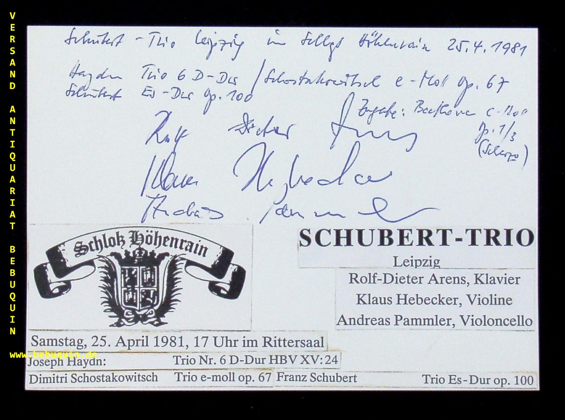 SCHUBERT TRIO.– ARENS, Rolf-Dieter + HEBECKER, Klaus + PAMMLER, Andreas: eigenhändig von allen signierte Autogrammkarte. Höhentain, 25.4.1981. 10,5 x 14,5 cm. große Karteikarte. Rolf-Dieter Arens (* 16. Februar 1945 in Zinnwald) ist ein deutscher Hochschullehrer und Pianist. Von 2001 bis 2010 war er Rektor an der Hochschule für Musik Franz Liszt Weimar. (Wikipedia)