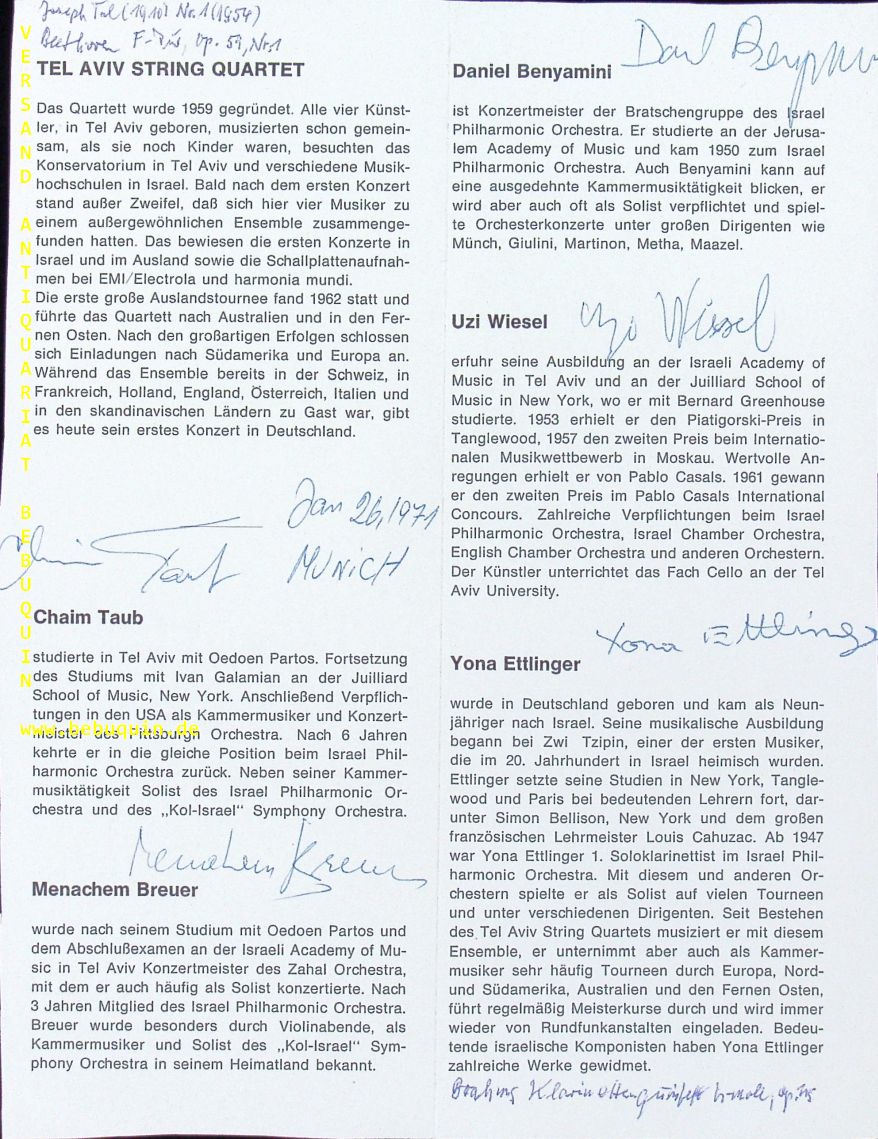 TEL AVIV STRING QUARTETT.– ETTLINGER, Yona (Klarinettist) + TAUB, Chaim + BREUER, Menachem + BENYAMINI, Daniel + WIESEL, Uzi: eigenhändig datierte und von allen signierte Programmseite. München (Herkulessaal); 26.1.1971. 24, 5 x 19 cm. 3 Bl. Yona Ettlinger war Klarinettistin und spielte und unterrichtete in Israel, Frankreich und England. Ettlinger gilt als prominenter klassischer Klarinettist seiner Generation und als einer der bekanntesten Instrumentalisten Israels. (Wikipedia)