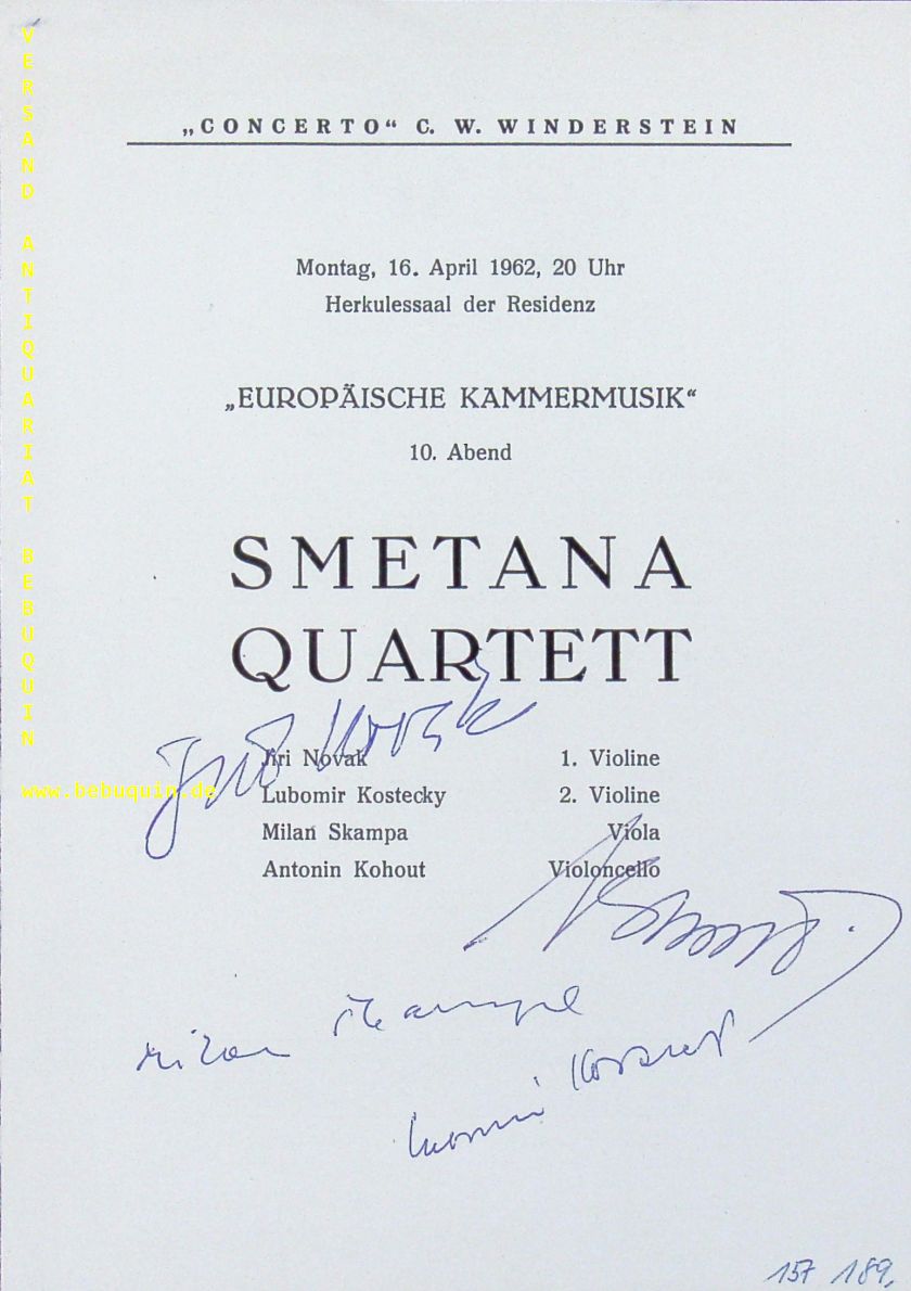 SMETANA-QUARTETT.– KOHOUT, Antonin + NOVAK, Jiri + KOSTECKY, Lubomir + SKAMPA, Milan: eigenhändig von allen signierte Programmseite. München, 16.4.1962. 21 x 14,5 cm. 1 Bl. Das Smetana-Quartett war ein tschechisches Streichquartett, das von 1945 bis 1989 bestand. Es entstand aus dem Streichquartett des Tschechischen Konservatoriums, das 1943, während der nationalsozialistischen Besatzungszeit, vom Cellisten Antonin Kouhout gegründet worden war. (Wikipedia)