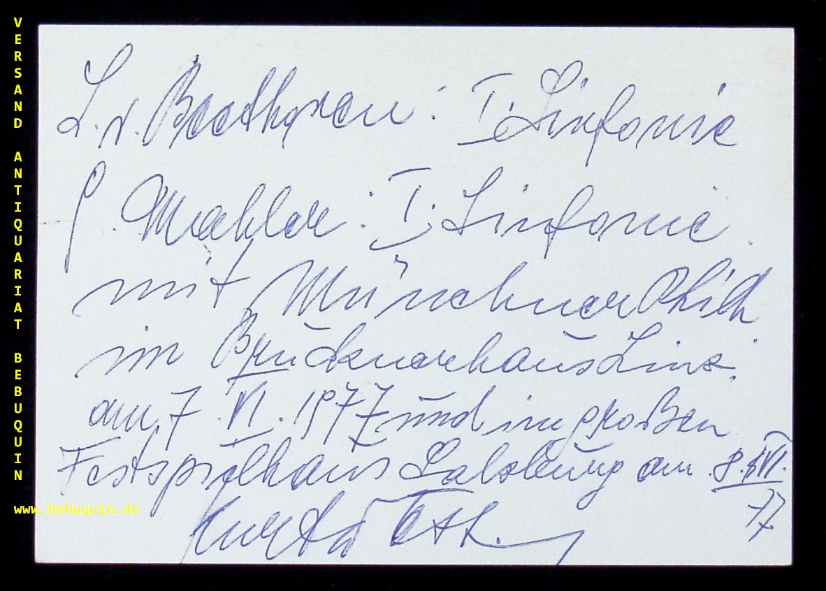 WÖSS, Kurt (Dirigent): eigenhändig textreich beschriebene signierter und datierter Autogrammkarte. Salzburg (Festspielhaus), 8.6.1977. 10,5 x 14,5 cm. große Karteikarte. Kurt Wöss (* 2. Mai 1914 in Linz; † 4. Dezember 1987 in Dresden) war ein österreichischer Dirigent. (Wikipedia)