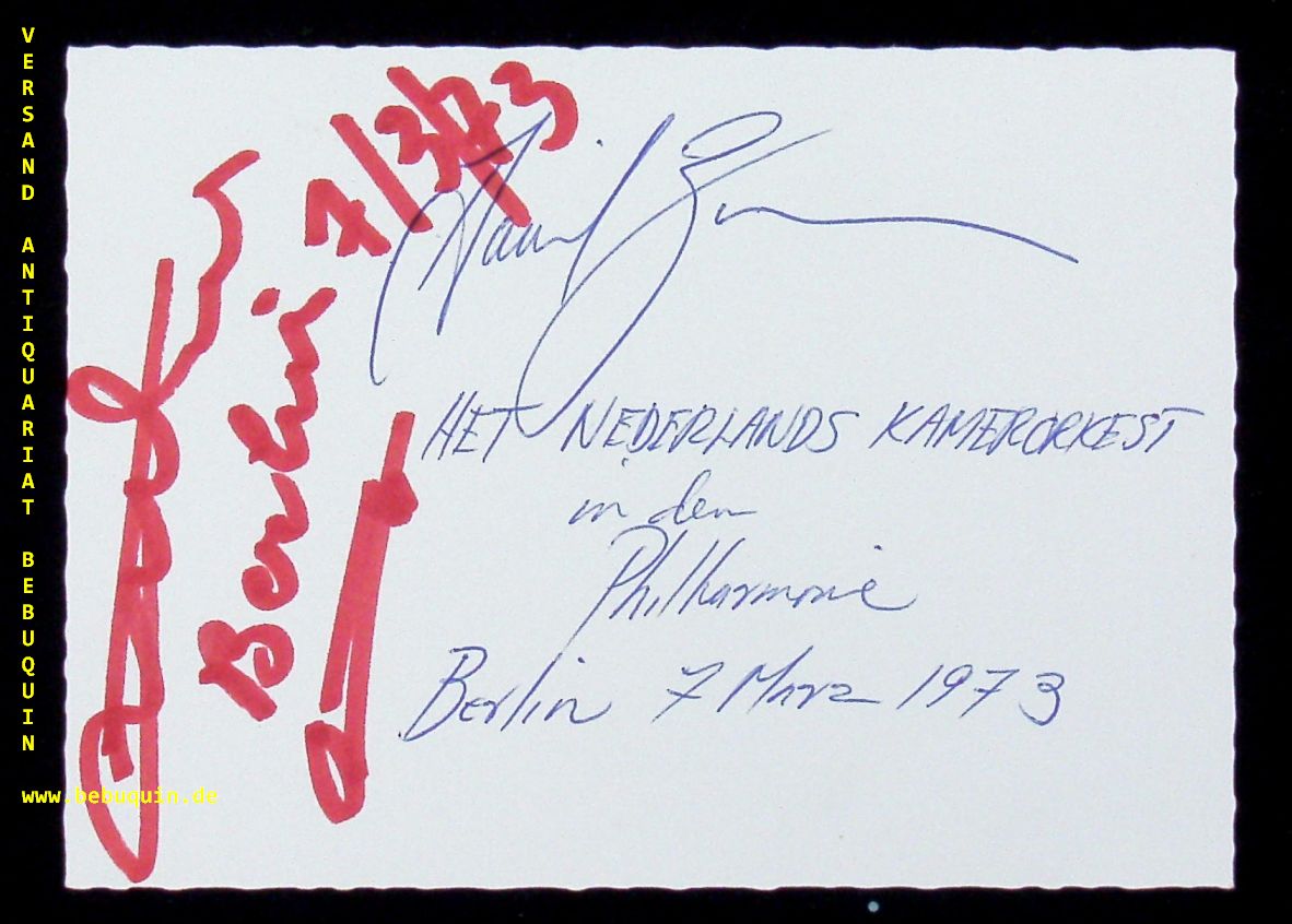 ZINMAN, David (Dirigent) + ANDRE, Maurice (Trompeter): eigenhändig datierte und von beiden signierte Autogrammkarte. Berlin (Philharmonie), 7.3.1973. große Karteikarte. David Joel Zinman (* 10. Juli 1936 in New York) ist ein US-amerikanischer Dirigent. Maurice André (* 21. Mai 1933 in Alès; † 25. Februar 2012 in Bayonne) war ein französischer klassischer Trompeter und Hochschullehrer. (Wikipedia)