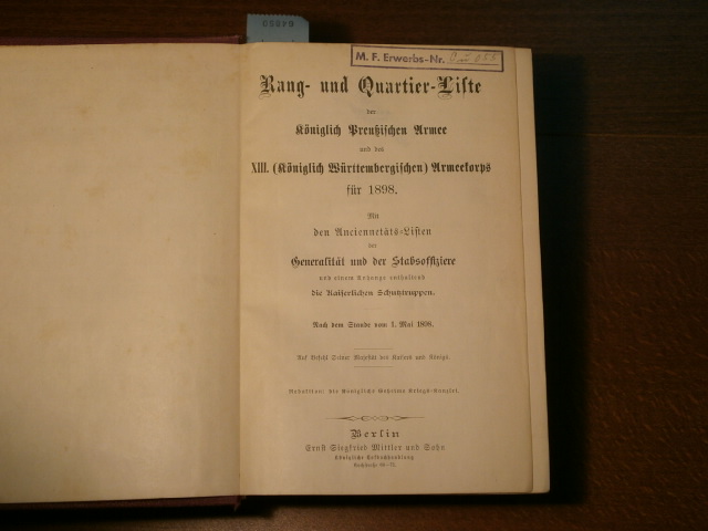 RANG- UND QUARTIER-LISTE DER KÖNIGLICH PREUSSISCHEN ARMEE UND DES XIII. (Königlich Württembergischen) ARMEEKORPS FÜR 1898.– Mit den Anciennetäts-Listen der Generalität und der Stabsoffiziere und einem Anhange enthaltend die Kaiserlichen Schutztruppen. Berlin (Mittler), 1. Mai 1898. XXIV, 1315 S. OHLn mit goldgeprägtem Rücken..