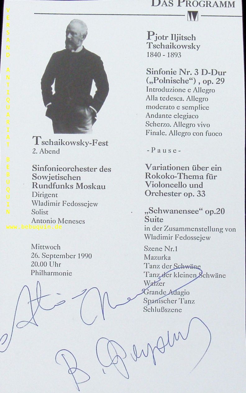MENESES, Antoni (Cellist) + FEDOSSEJEW, Wladimir (Dirigent): eigenhändig von beiden signierte Programmseite. München (Herkulessaal), 26.9.1990. 19 x 11,5 cm. 1 Bl. Antônio Meneses Neto (* 23. August 1957 in Recife, Pernambuco) ist ein brasilianischer Cellist. Er war Professor an der Musik-Akademie der Stadt Basel und Cellist des weltberühmten Beaux Arts Trios. Wladimir Iwanowitsch Fedossejew (* 5. August 1932 in Leningrad) ist ein russischer Dirigent. (Wikipedia)