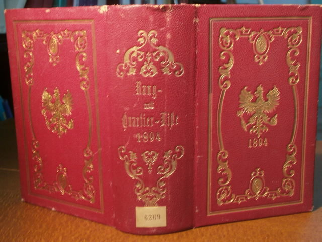 RANG- UND QUARTIER-LISTE DER KÖNIGLICH PREUSSISCHEN ARMEE UND DES XIII. (Königlich Württembergischen) ARMEEKORPS FÜR 1894.– Mit den Anciennetäts-Listen der Generalität und der Stabsoffiziere. Berlin (Mittler), 20.5.1894. XXIV, 1277 (1) S. Roter Saffian-Band der Zeit mit reicher Vergoldung (Preußischer Adler auf beiden Deckeln) und dreiseitigem Goldschnitt. makuliertes Bibliotheksex., oberes Kap. etwas bestoßen, vorderes Gelenk wenig gelockert, sonst schönes Ex.
