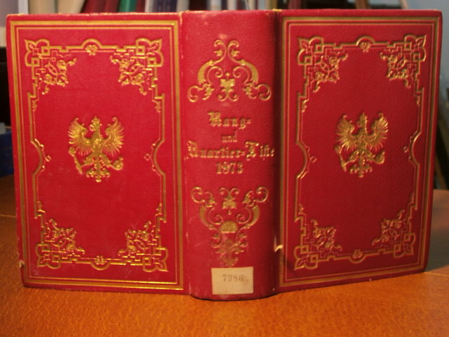 RANG- UND QUARTIER-LISTE DER KÖNIGLICH PREUSSISCHEN ARMEE UND MARINE FÜR DAS JAHR 1873.– Nebst den Anciennetäts-Listen der Generalität und der Stabs-Offiziere der Armee und der Flagg- und Stabs-Offizeire der Marine. Berlin (Mittler), 1873. XIII, 936 S. mit einem Faltblatt im Anhang mit der Übersicht der Armee-Einteilungen. Roter Saffian-Band der Zeit mit reicher Vergoldung (Preußischer Adler auf beiden Deckeln) und dreiseitigem Goldschnitt. makuliertes Bibliotheksex., kleine Schabestelle an der Kante, sonst prächtige Erhaltung.