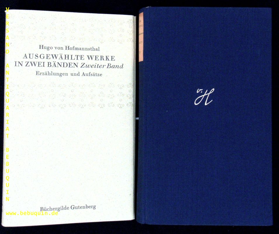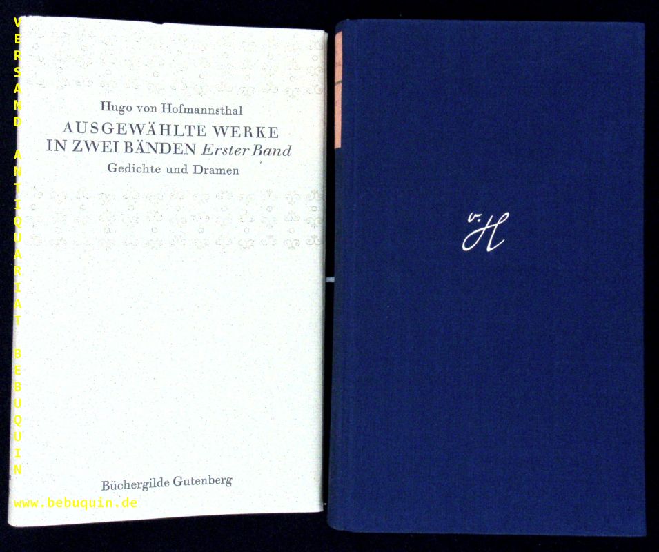 HOFMANNSTHAL, Hugo von: Ausgewählte Werke in zwei Bänden. Frankfurt am Main (Büchergilde Gutenberg), ca 1960. 762, 774 S. auf Dünndfruckpapier. OLn mit Goldprägung und OUmschl. tadellos. 1. Aufl. dieser Ausgabe.